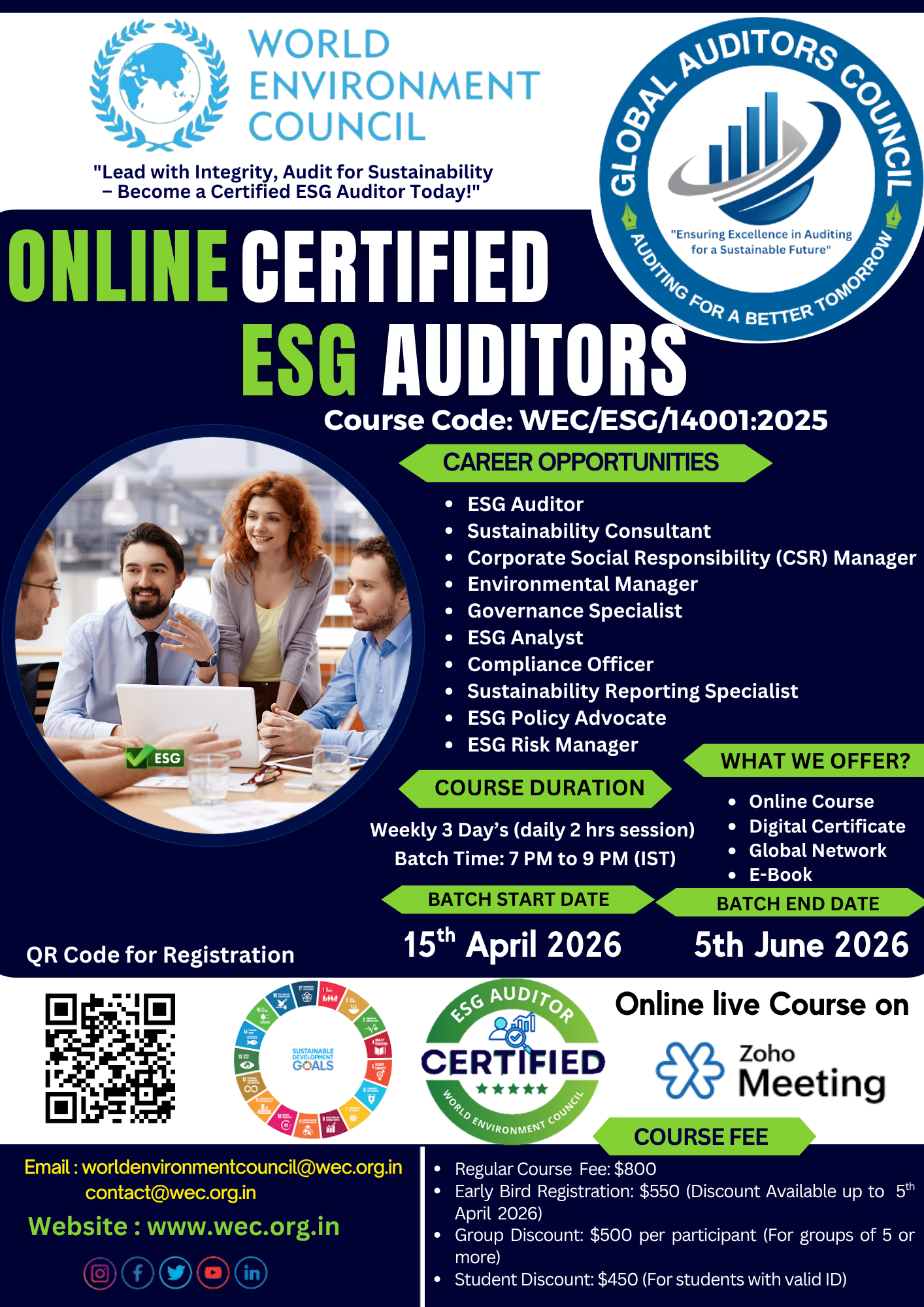 Welcome to courses.wec.org.in, the World Environment Councilโs dedicated platform for transformative learning in Environmental, Social, and Governance (ESG) education. Led by Prof. Ganesh Channa, the Founder and President of the World Environment Council, we are proud to be pioneers in ESG Sustainability Reporting and Certified ESG Auditor training. Our courses are designed to equip professionals and students alike with the skills and knowledge needed to make a meaningful impact in sustainability and ESG practices. Certified ESG Sustainability Reporting and Certified ESG Auditor courses are carefully structured by a team of ESG experts to meet the growing global demand for transparency, accountability, and sustainability. Through multiple successful batches, we have received widespread international response, affirming our commitment to empowering individuals and organizations to drive sustainable change. Our Certified ESG Sustainability Reporting and Certified ESG Auditor courses are carefully structured by a team of ESG experts to meet the growing global demand for transparency, accountability, and sustainability. Through multiple successful batches, we have received widespread international response, affirming our commitment to empowering individuals and organizations to drive sustainable change. With a curriculum tailored to global ESG standards and delivered through flexible, accessible online and offline formats, courses.wec.org.in is your gateway to advancing in the ESG field and contributing to a sustainable future. Join us in shaping responsible business practices, fostering environmental stewardship, and championing social impact worldwide. World Environment Council โ Building a Sustainable Tomorrow, Today.